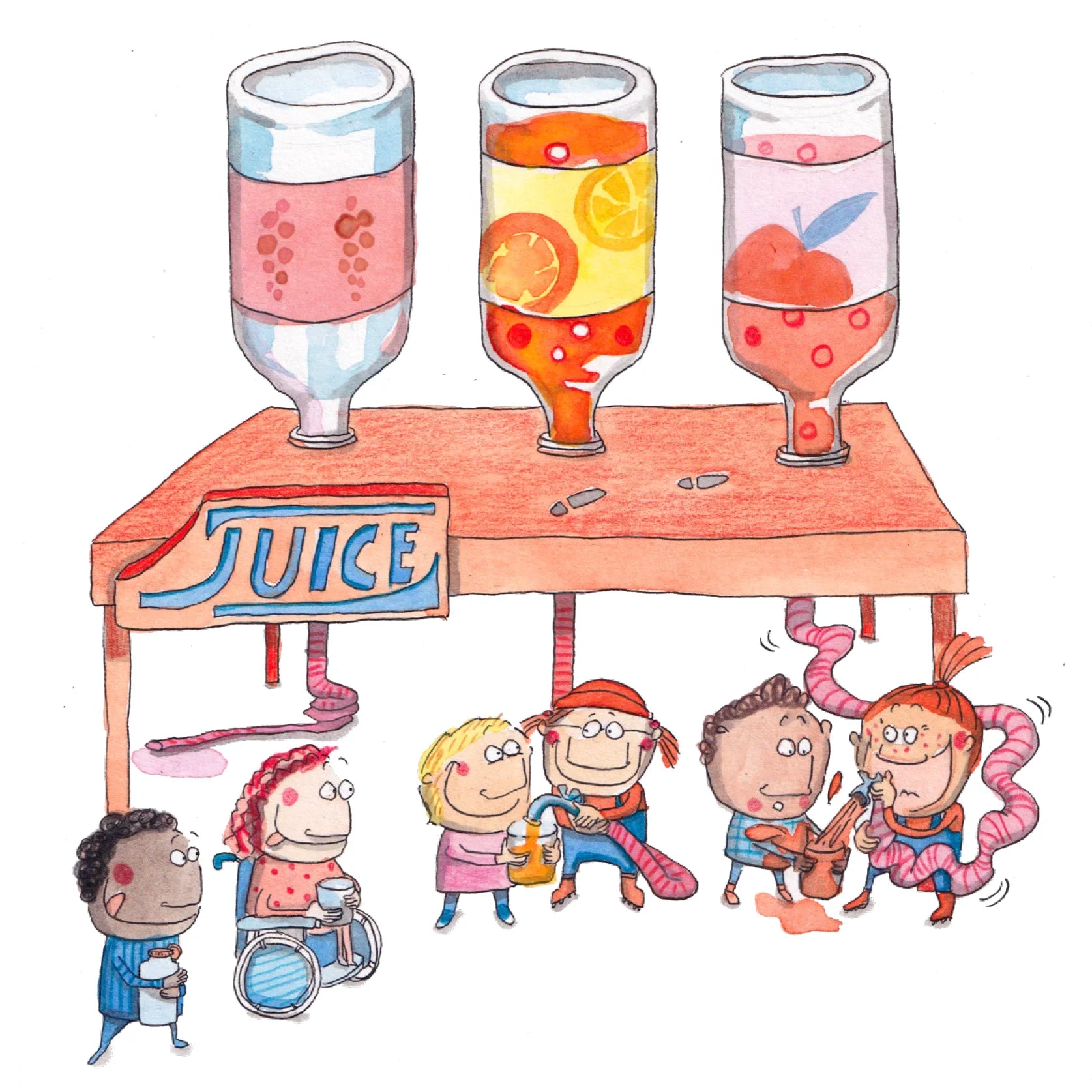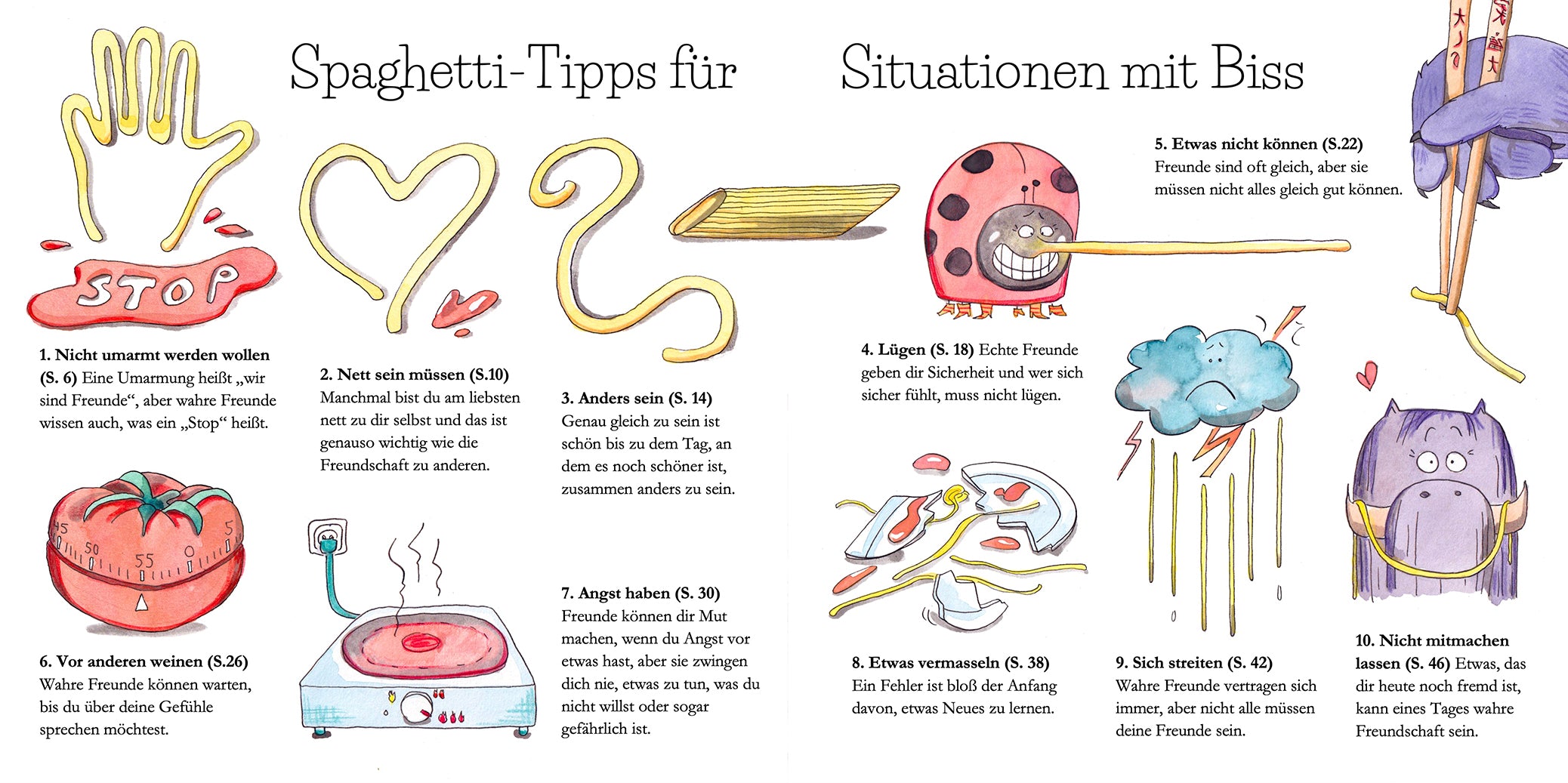 Diese Illustrationen stammen aus dem Kinderbuch "Freundschaft al dente", 2024-2025 (unveröffentlicht), Auftraggeber Gutenbergschule FAM. Ein interaktives Kinderbuch über Konfliktsituationen unter Freunden.