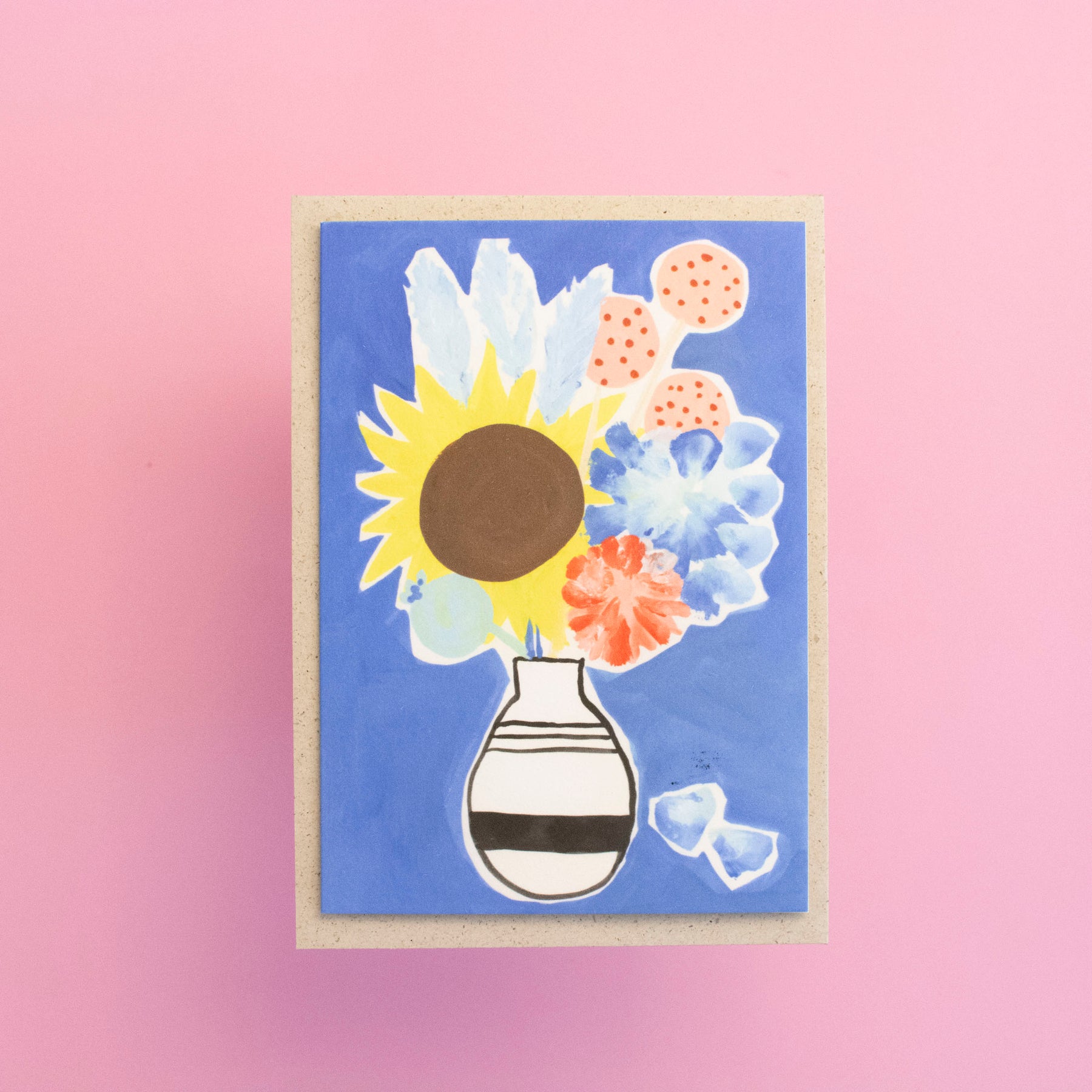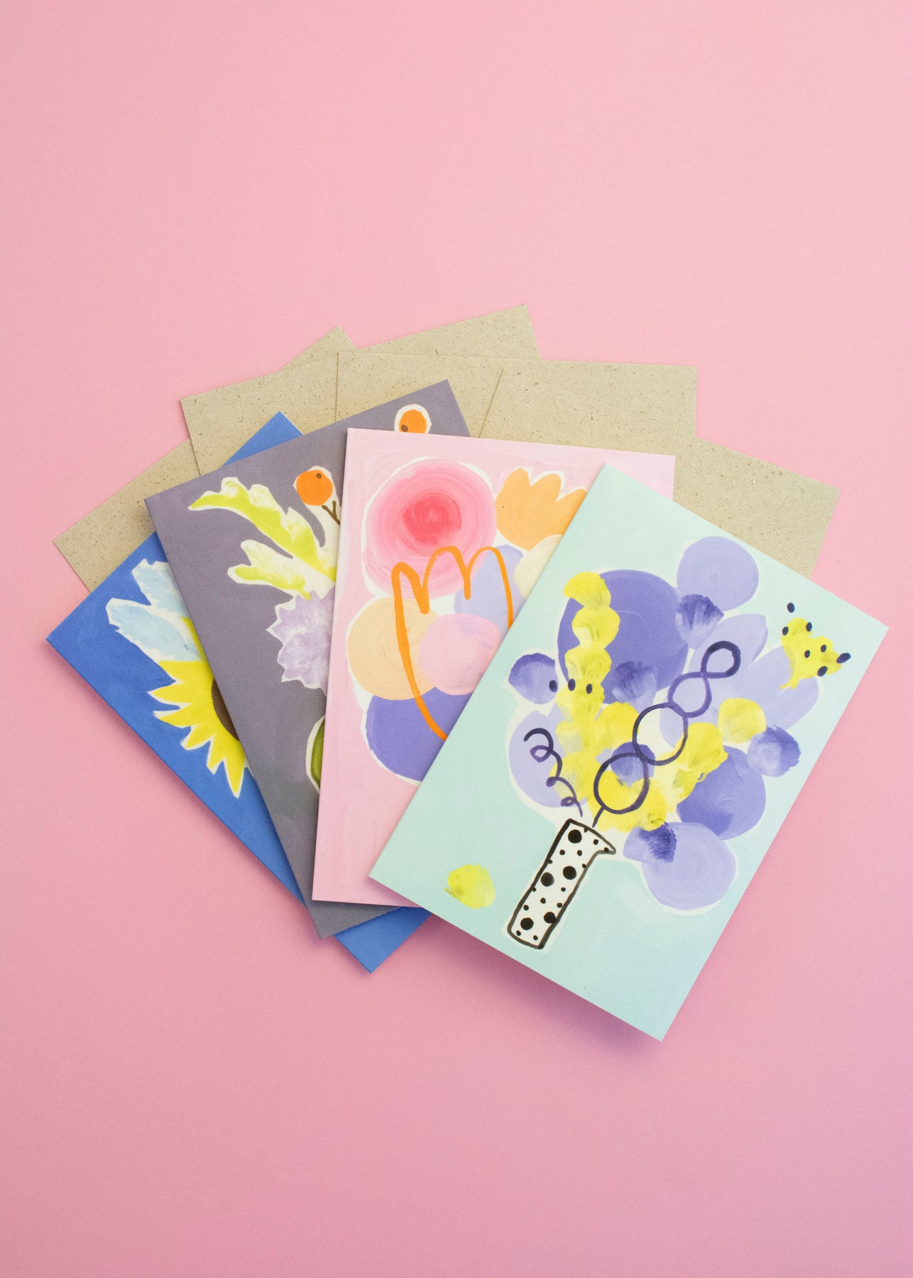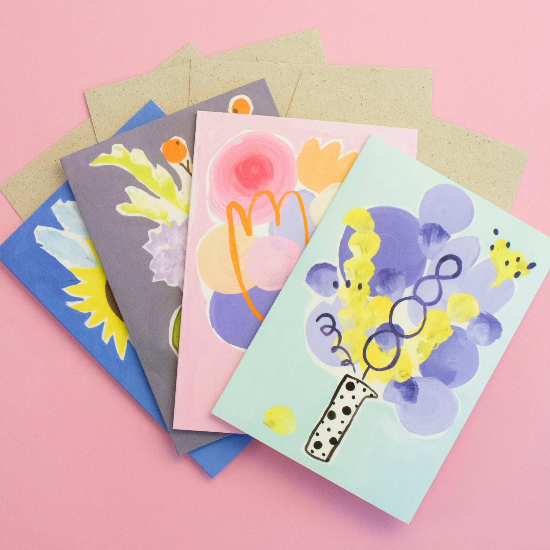4 x Kunstdruck auf Bambuspapier, inkl. Graspapierumschläge. Alle 4 Motive der Blumenstrauß-Serie.